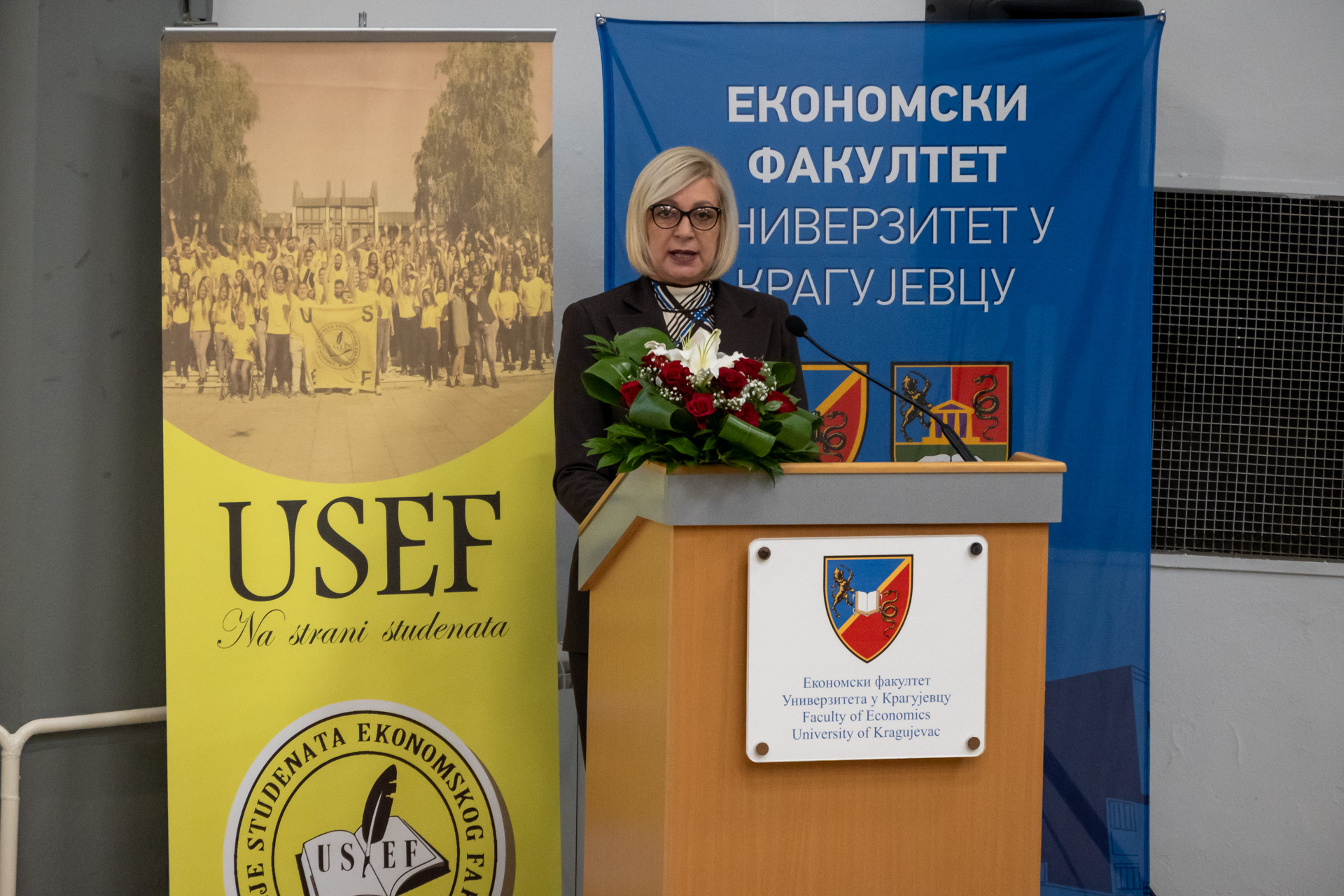 Затим се студентима обратила проректор за научно-истраживачки рад Универзитета у Крагујевцу, проф. др Биљана Петровић, наводећи да је знање основа развоја сваког друштва и да је Универзитет у Крагујевцу ту да студентима Економског факултета студије учини још садржајнијим и лепшим. Господин Душан Алексић члан Градског већа Града Крагујевца за образовање пожело је будућим студентима, који нису из Крагујевца, добродошлицу у град Крагујевац и успешно школовања свим новоуписаним студентима.