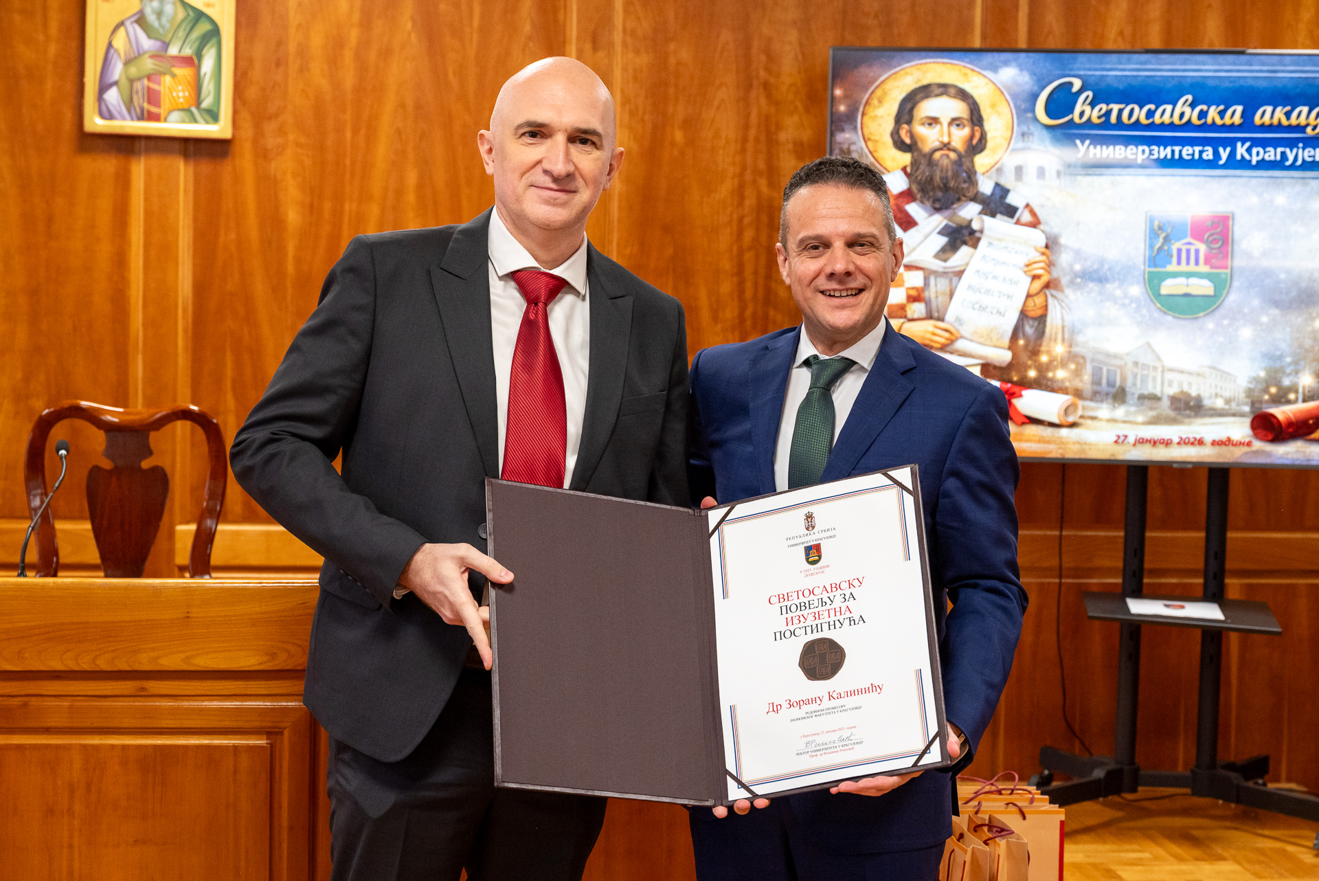 Светосавска награда за изузетна постигнућа за 2025. годину додељена је др Зорану Калинићу, редовном професору Економског факултета Универзитета у Крагујевцу, за изузетан допринос научном и наставном раду, као и укупном развоју академске заједнице.